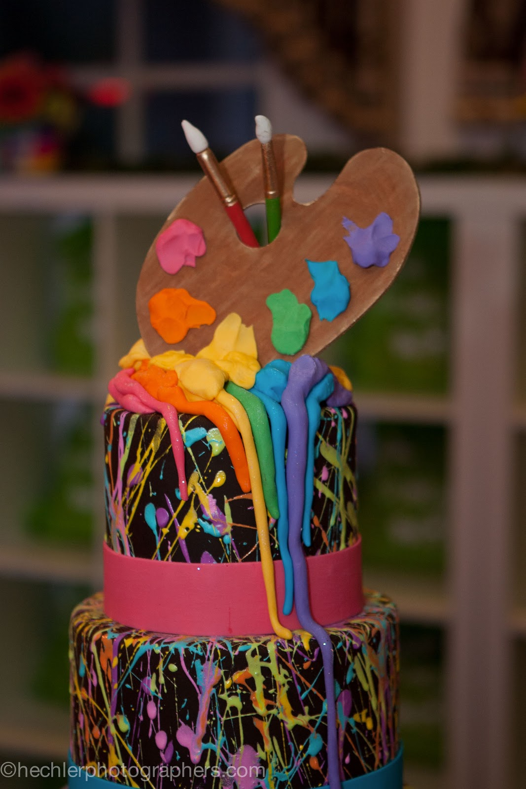We had so much fun designing Jacoby Sayre's Bat Mitzvah cake! Her playful artist-themed reception inspired us to create a five-tiered vanilla cake with chocolate fondant, which we "splatter-painted" with multi-colored icing, a la Jackson Pollock. The top tier boasted a gum-paste painter's palate with brushes and fondant paint colors, which spilled down the cake tiers. The base of the cake was decorated with Jacoby's name, and pink and orange flowers, all in the same style and font as the invitation and celebration details.